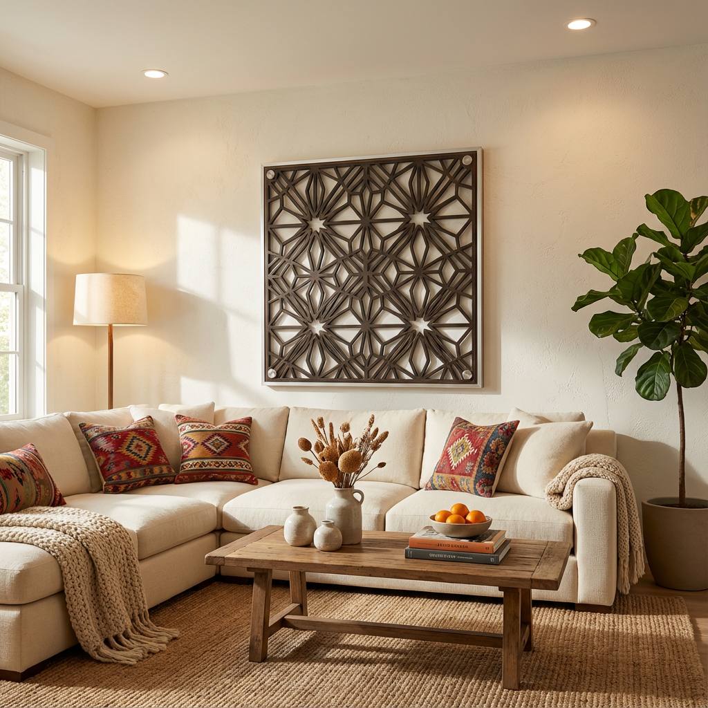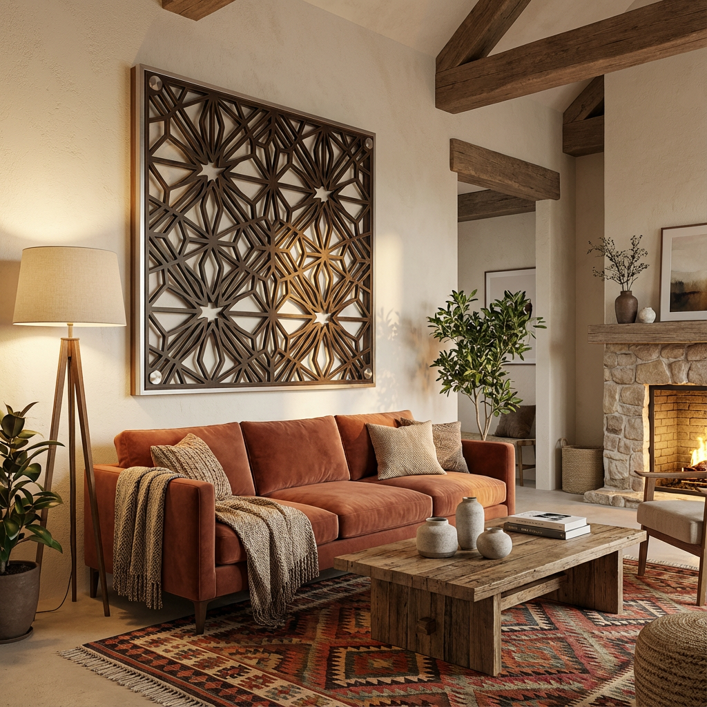 Use it as the anchor on a large wall: center it above a 72"–90" console/sofa. Add a picture light or nearby sconce to emphasize the cutout shadows and bring out the pattern depth.